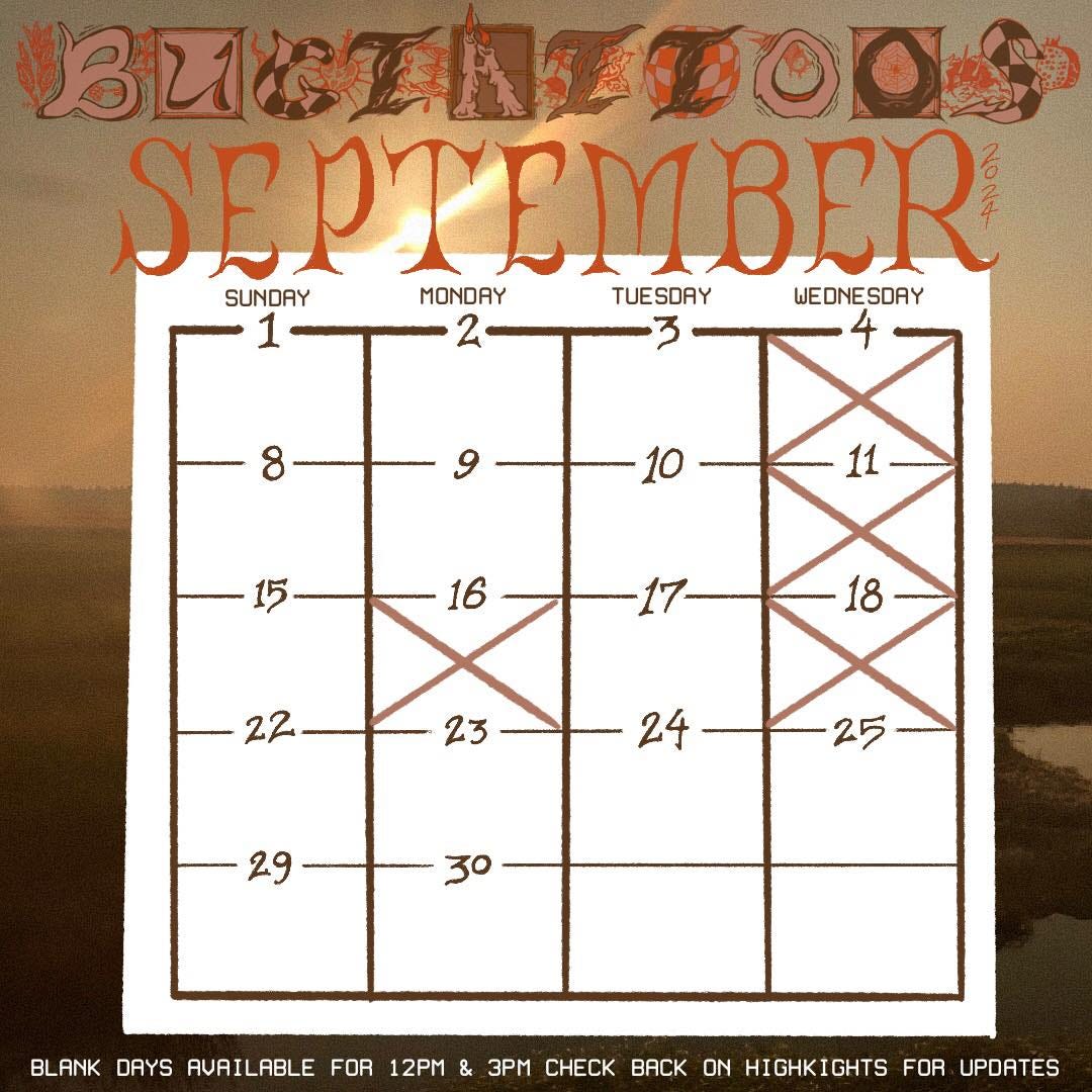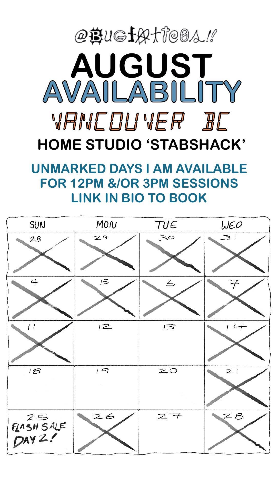 Anyways, if youβre interested in booking with me in September as always you can reach me using this form or direct at bugcruickshank@gmail.com. Iβll share my current availability below.
